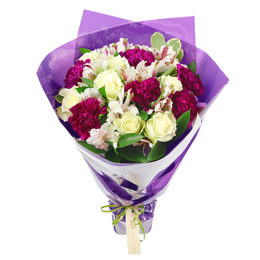 Bring the warmth of summer into any space with our sunlit summer bouquet. This elegant arrangement features fresh white roses, stunning alstroemeria, and vibrant purple carnations, all beautifully combined with lush greenery to highlight nature's true colors.