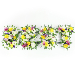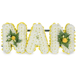 Set against a clean white background, this touching floral tribute spells out the name "KATE" in bold, clearly defined capital letters, the sort of thoughtful memorial often seen at churches and crematoriums around South Norwood. Each letter is filled edge to edge with pristine white chrysanthemums, their small, rounded heads creating a velvety, cloud-like surface that looks soft to the touch and quietly dignified. A fine border of pale blush-pink ribbon trims the outline of every letter, its gentle ruffle adding movement and a whisper of colour, as if a soft breeze had brushed past. The purity of the white flowers is beautifully offset by carefully placed accents of greenery and exotic blooms. On the "K" and "T", striking yellow-green cymbidium orchids with warm russet markings sit among glossy foliage and delicate fern fronds, their unusual colouring drawing the eye and hinting at a life well-lived and remembered. On the "A" and "E", glossy red anthuriums, each perfectly heart-shaped, rise from the cushion of white petals, their waxy sheen and central spadix symbolising resilient love in the midst of grief. Fine green trails and looping stems arc gracefully from one letter to the next, visually tying the name together and echoing the natural curves of climbing plants in the gardens and terraces near Portland Road. This personalised name arrangement would rest beautifully beside a coffin or at the front of a chapel, a bespoke farewell crafted with the sensitivity and steady hands of a local South Norwood florist who understands how flowers can speak when families cannot.