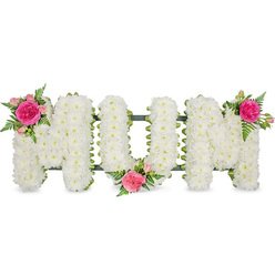 Set against a clean, white studio background, this floral tribute spells out "MUM" in three generous block letters, created with the meticulous care of an experienced South Norwood florist. The letters are completely carpeted in snowy white spray chrysanthemums, each floret small and perfectly formed, giving the surface a soft, almost quilted texture that suggests tenderness and peace. A slim band of dark green ribbon or structural foliage traces the outlines, lending definition and framing the blooms without disturbing their serenity. Resting on this pure white canvas are three thoughtfully placed accents of colour. On the top left of the first M, a cluster of soft peach and blush pink roses nestles into the chrysanthemums, the petals layered like silk. Another grouping of the same warm roses sits in the hollow at the base of the U, while the third rests on the top right of the final M, creating a gentle visual rhythm across the tribute. Sprays of fresh greenery, including airy fern fronds and broader, glossy leaves, surround each cluster, adding depth and a natural garden feel that might remind someone of the quiet residential streets and green corners around Portland Road or the paths through South Norwood Lake. The flowers appear freshly arranged, with the roses slightly dewy and the chrysanthemums bright and crisp. The composition communicates love, purity, and gratitude, making it an especially fitting funeral arrangement for families in South Norwood seeking a dignified, personalised way to say goodbye to their mum.